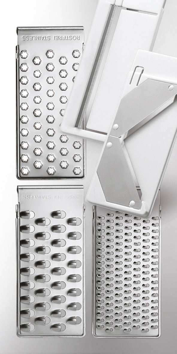 Förutom tomatsskäraren erbjuder denna mandolin en grov och fin rivare för grönsaker, en potatisrivare samt ett justerbart blad. Skärbladet kan justeras med en liten spak för att skära grönsaker och frukter i tunna eller tjocka skivor, efter önskemål. För att skydda insatserna från att tappas bort kan de sättas in på sidan av fodralet. En fingerbeskyddare skyddar fingrarna mot skador och säkerställer optimal användning. Alla insatser är tillverkade av rostfritt stål och tål maskindisk - en kvalitet som varar.