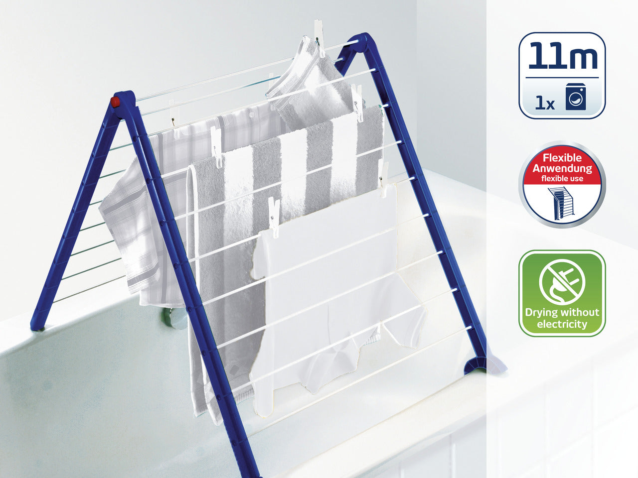 Tvätten är inte längre i vägen, tack vare Leifheit Pegasus Bath 110, en praktisk torkställning som är designad för att användas direkt på badkaret. Denna torkställning har formen av ett upp och nervänt "V" och kan enkelt placeras på alla typer av badkar. De två vingarna på Pegasus Bath 110 kan låsas i 12 olika positioner, vilket gör att den passar till alla badkarsbredder. För torkning av känsliga artiklar kan torkställningen även placeras platt på badkaret.