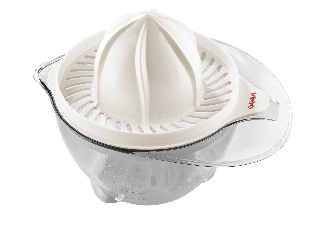 En stor behållare med mätskala rymmer saften från flera frukter. En praktisk pip gör det möjligt att hälla upp saften i ett glas utan att droppa.