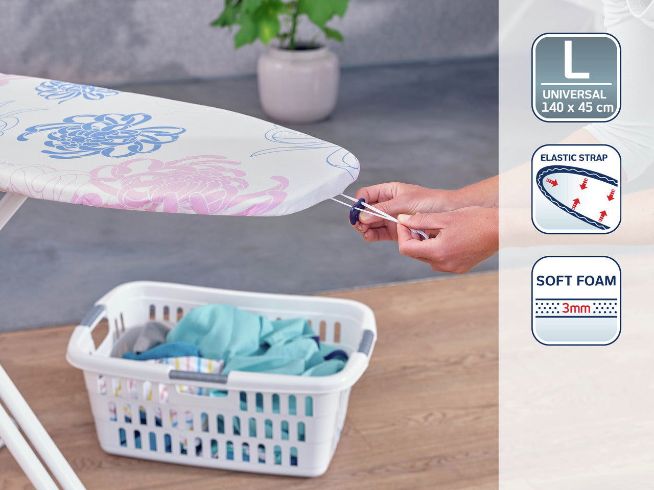 Lösning: Tack vare det elastiska dragsnöret och spännklämman sitter detta överdrag alltid säkert och stabilt. - Problem: Behov av extra komfort vid strykning.