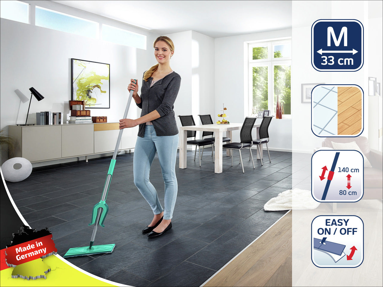 Leifheit Picobello M Golvmopp är en liten och bekväm golvmopp med stor effekt. Moppen är utrustad med en smidigt fungerande pressmekanism direkt på skaftet, vilket möjliggör en effektiv urvridning av moppdynan utan ansträngning, utan att behöva böja sig och utan att behöva sätta händerna i smutsigt vatten. Picobello M kommer med en microfiberdyna kallad "micro duo", som tack vare sitt 2-fibersystem avlägsnar smuts grundligt från alla typer av golv.