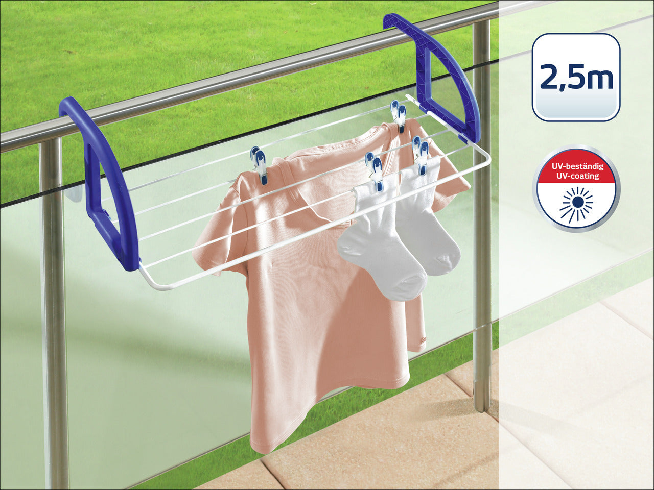 Enkel Användning med Robusta Upphängningar:Med Leifheit Hängande Torkställning 25 behöver du bara en hand för att torka din tvätt. Dess robusta upphängningar kan enkelt fästas på balkongräcket utan något behov av borrning eller oro för damm och smuts.