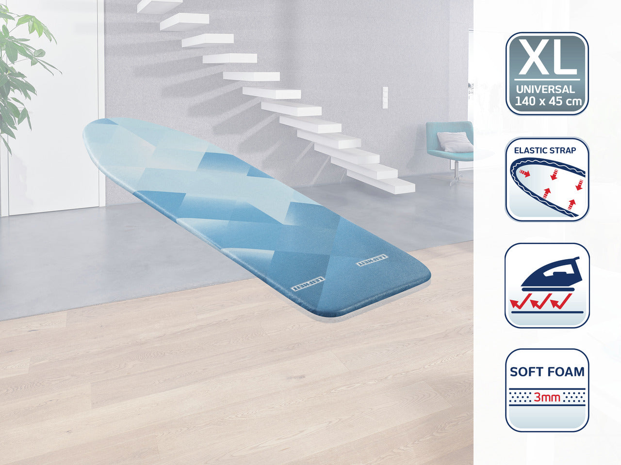 - Flexibel användning: Passar stora strykbrädor upp till 140 x 45 cm och fungerar utmärkt med både ångstrykjärn och ångstationer.