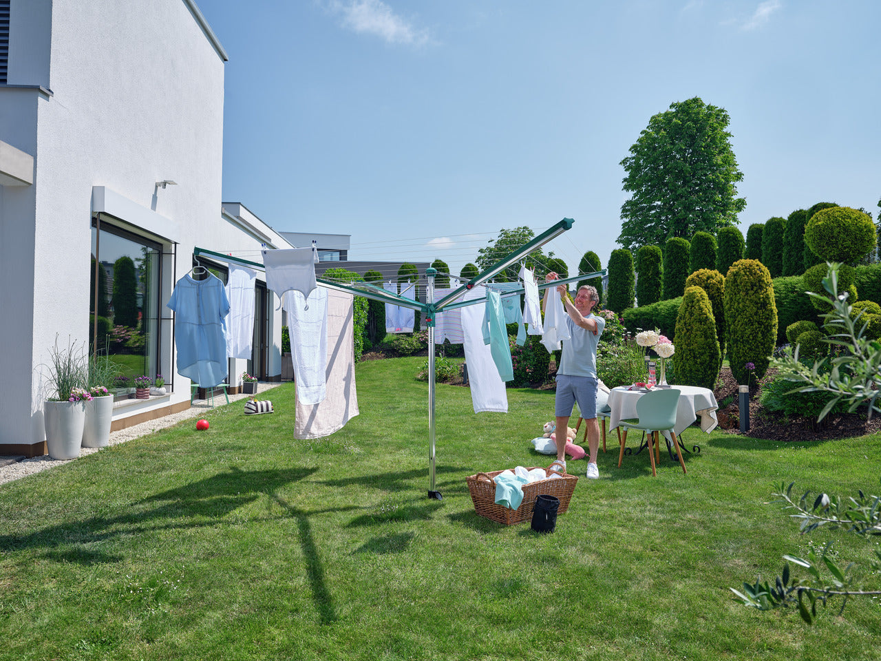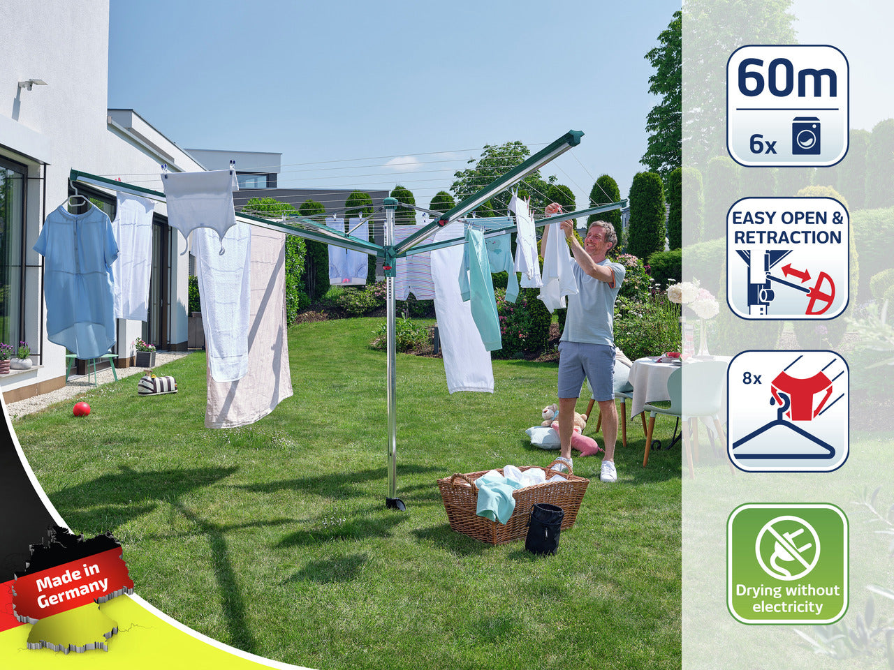 - Generös torkkapacitet: 60 meter linlängd som rymmer upp till sex tvättmaskinsladdningar.