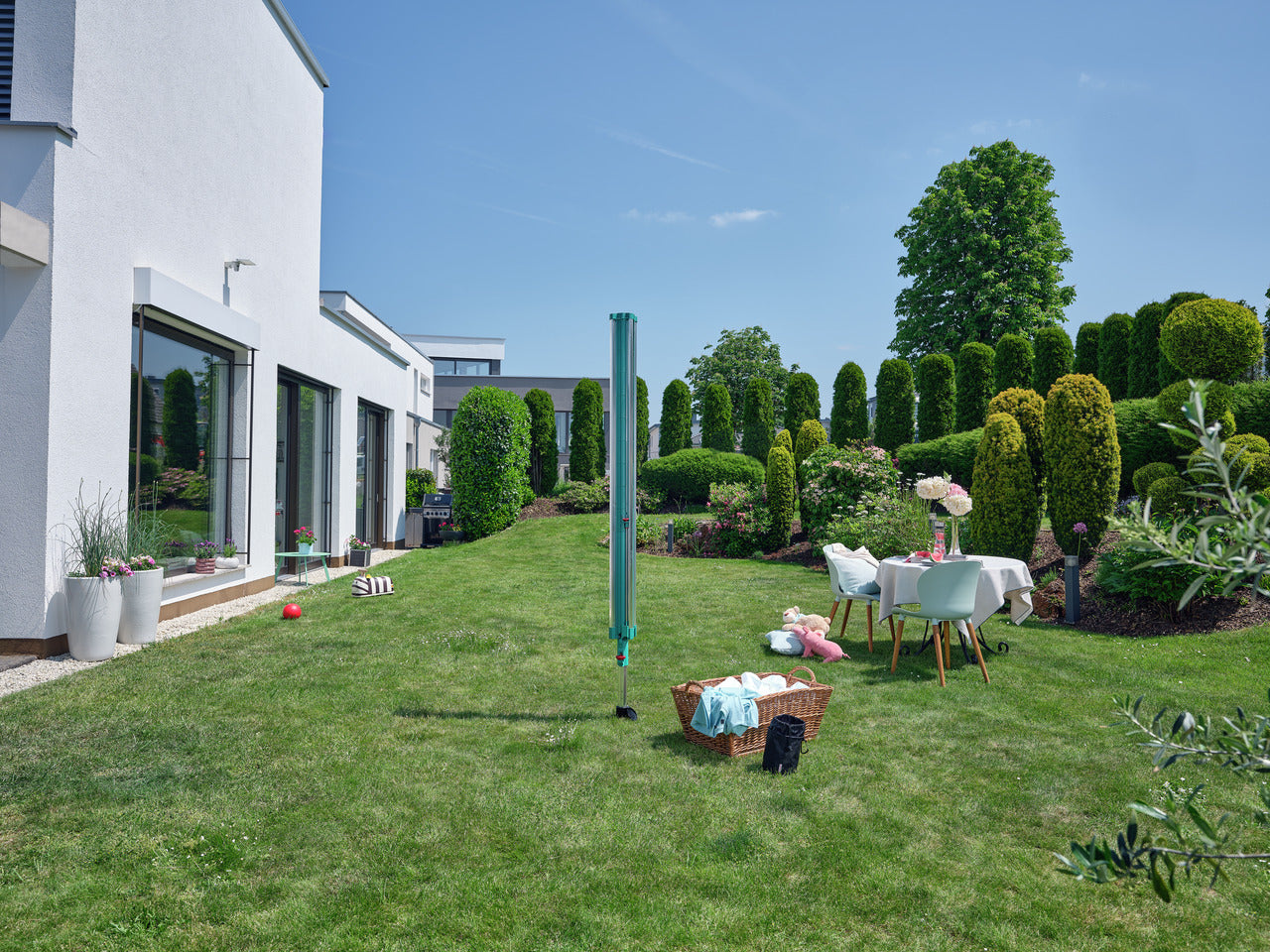 Den extra skyddskåpan ger pålitligt skydd runt om torkvindan tack vare sitt slitstarka och vattentäta material. Med en linlängd på totalt 60 meter, erbjuder Linomatic 600 Deluxe tillräckligt med utrymme för att torka upp till sex tvättmaskinsladdningar utomhus i friska luften på en gång. Tvätten torkar skonsamt och naturligt i vinden, utan att kosta en krona i el. För extra torkutrymme är varje av de fyra armarna utrustade med två krokar, vilket ger plats för att hänga upp åtta skjortor och blusar på galgar, utan att de får veck.