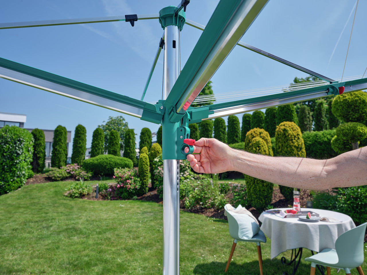 Torkvindan öppnas med minimal ansträngning tack vare det innovativa Easy-Lift-Systemet, som gör det upp till 20 % enklare att använda jämfört med andra Linomatic-modeller. Genom att dra i dragsnöret visas linorna, och med tiden hålls de automatiskt sträckta genom de olika låspunkterna som finns tillgängliga. När torkvindan inte används, dras dragsnöret in automatiskt, skyddat från skador och utom räckhåll för marken, vilket eliminerar snubbelrisk och underlättar gräsklippning.