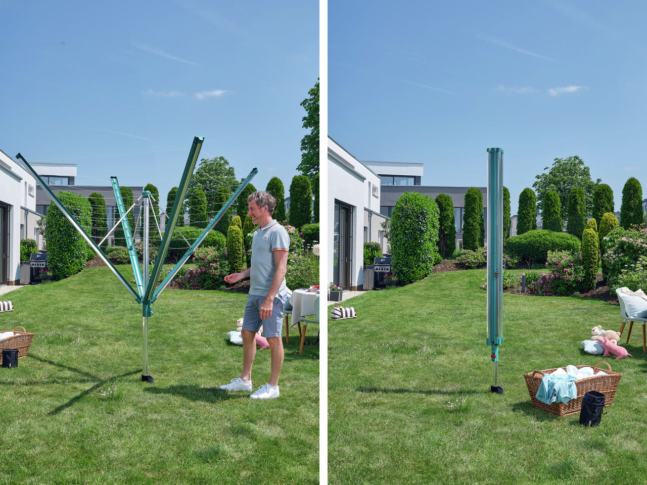 Tack vare Easy-Close-Comfort-funktionen är det enkelt och praktiskt att stänga torkvindan. En knapp på armarna i ögonhöjd gör det lätt att låsa och stänga torkvindan utan att behöva böja sig. När torkvindan är stängd, skyddas linorna säkert inuti armarna, och nästa gång du använder torkvindan sträcks linorna automatiskt. Smutsiga linor från konventionella torkvindor, som lämnar fula märken på tvätten, är nu ett minne blott.