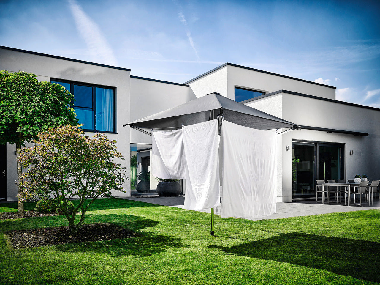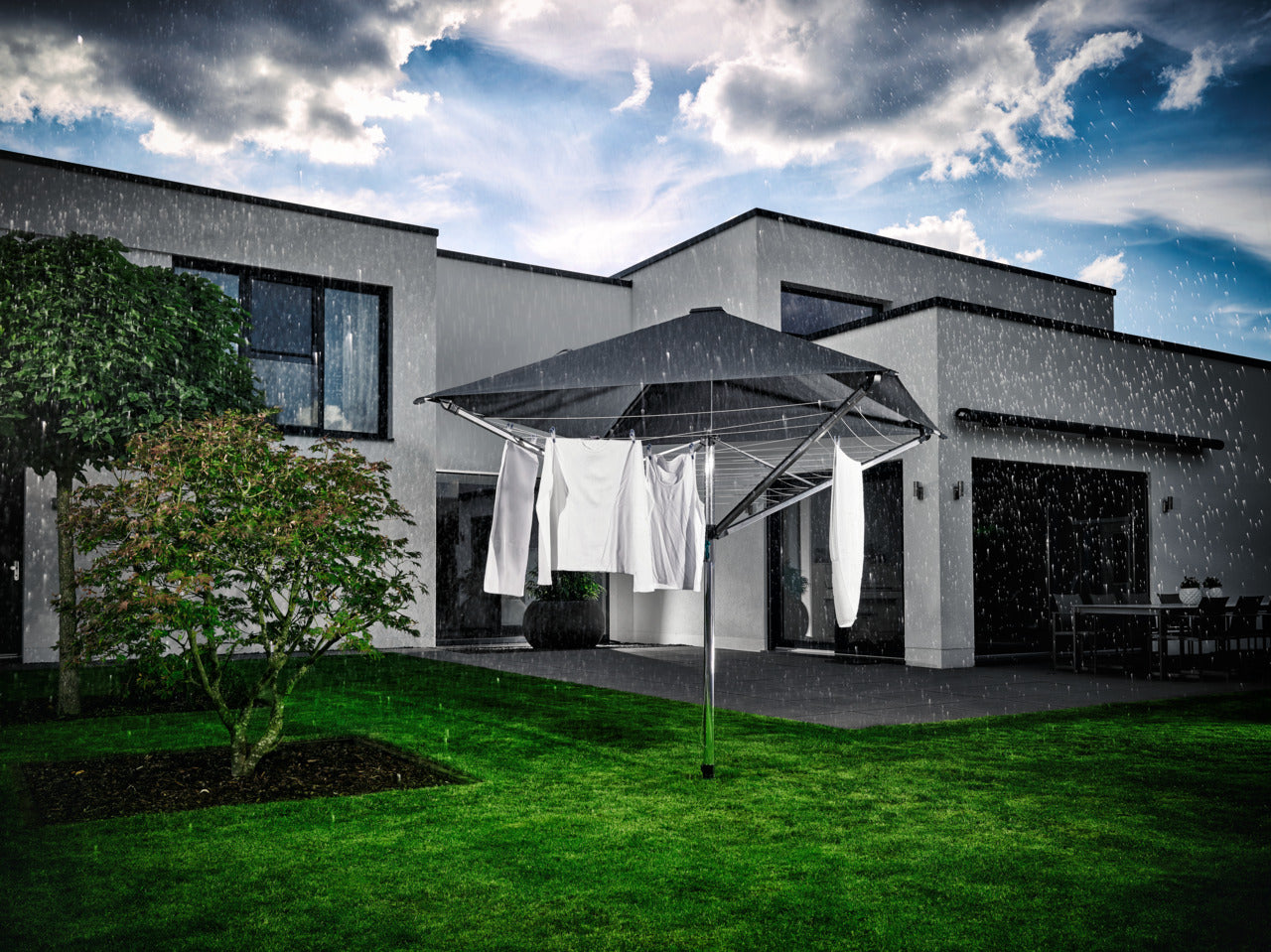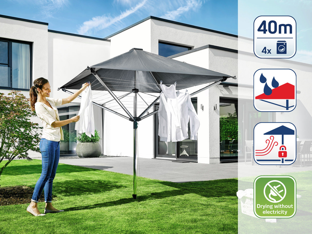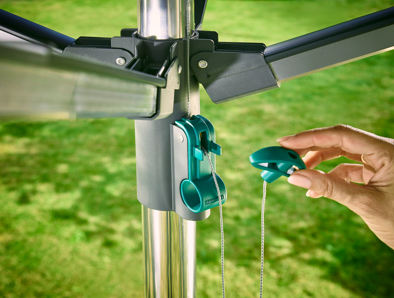 - Integrerat regnskydd: Skyddar tvätten och linorna från regn, UV-strålar, smuts och damm.