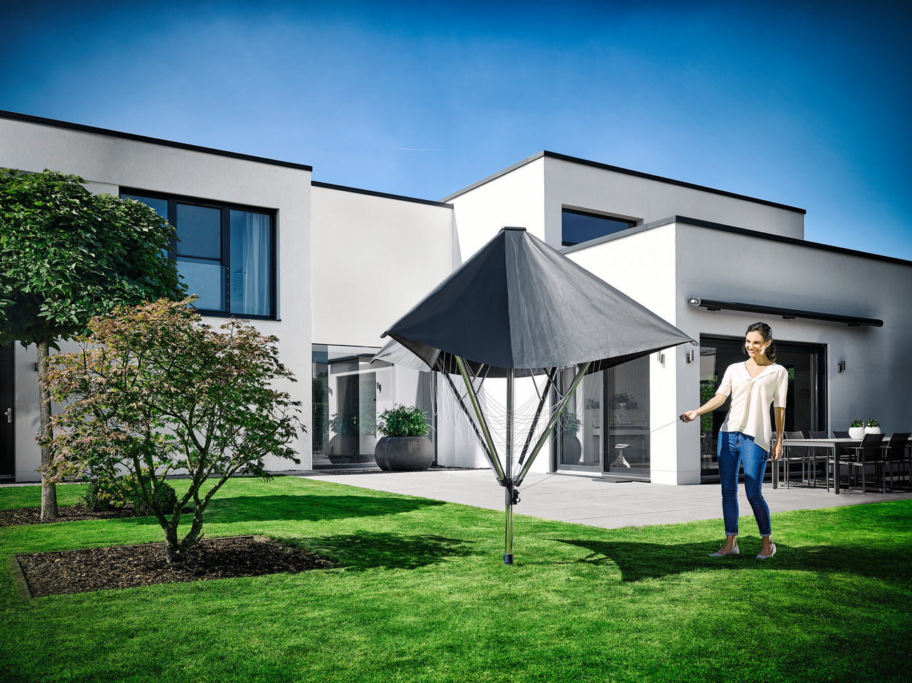 Torkvindans armar fälls enkelt ihop när den inte används, och linorna förvaras säkert under skyddet, vilket håller dem fria från damm och smuts. När den är hopfälld liknar denna torkvinda ett parasoll, vilket hjälper dig att glömma bort hushållsarbetet och njuta av din fritid i trädgården.