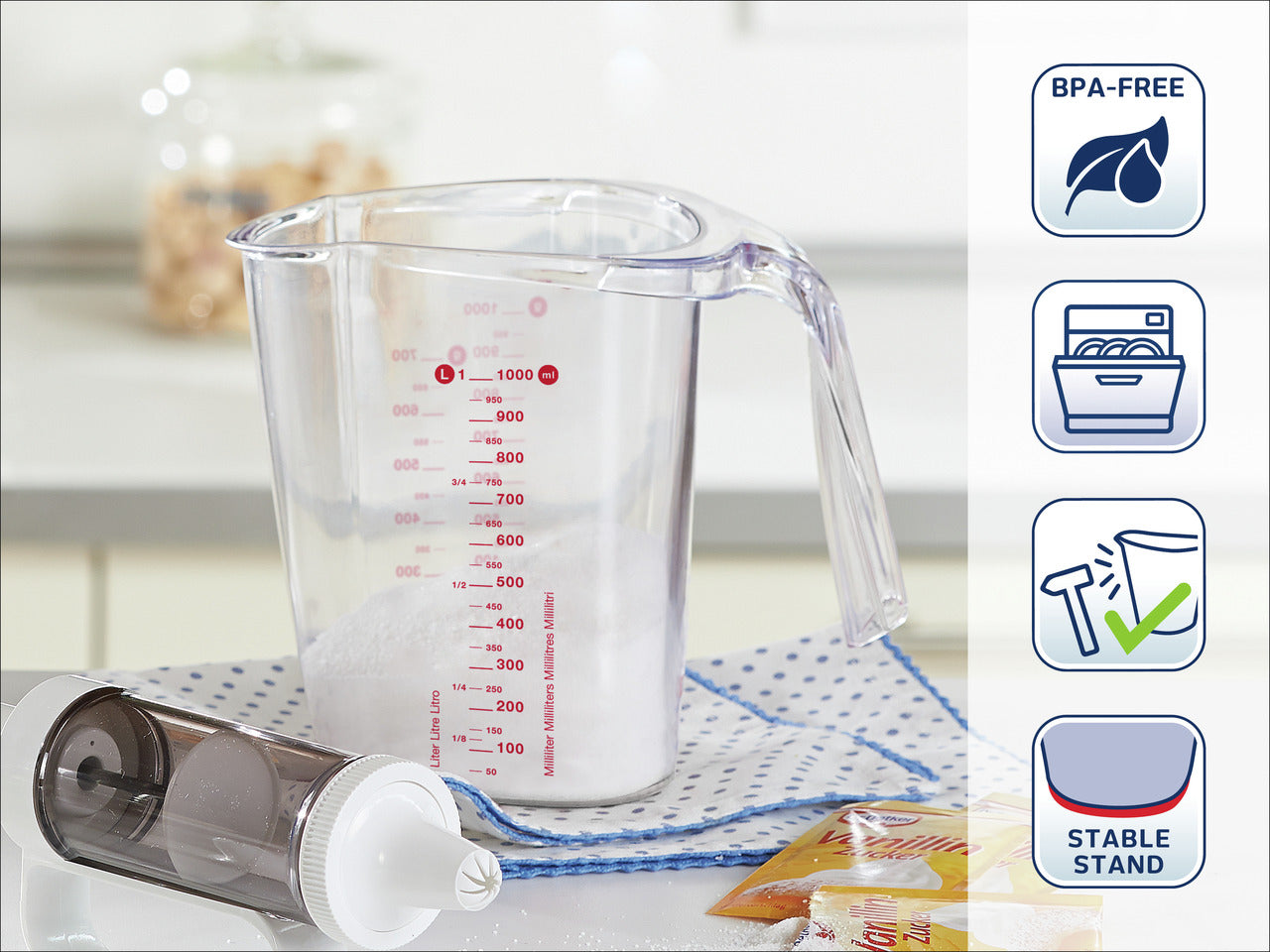 Utforska en ny nivå av noggrannhet i matlagningen med Leifheit Måttkanna. Denna eleganta design i robust plast är både funktionell och stilfull. Med tydliga mätvärden på den transparenta ytan kan du enkelt mäta mjöl, socker och vätskor. Dessutom kan du mäta internationella enheter som pints, cups och fluid ounces - perfekt för alla som älskar att använda originalrecept från hela världen. Med denna måttkanna slipper du tidskrävande omvandlingar. Dessutom är den utrustad med en praktiskt droppfri pip, vilket gör hällningen enkel och ren. Den gummibelagda basen ger stabilitet och förhindrar halkning. Med en volym på 1 liter har du tillräckligt med utrymme för alla dina måttbehov.