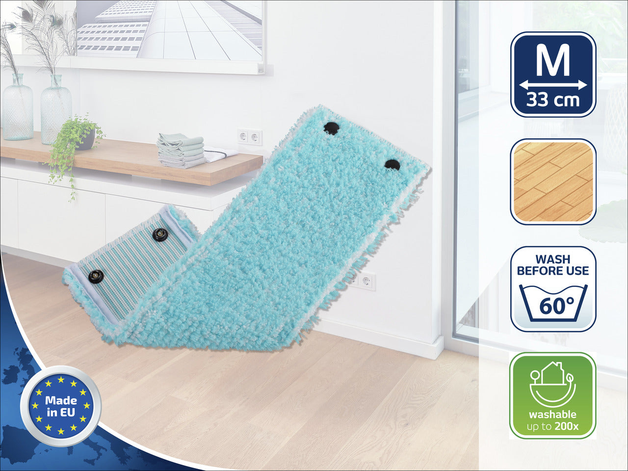 Inga repor, inga ränder och framför allt inga vattenskador: Leifheit CLEAN TWIST M Moppöverdrag Super Soft i kombination med golvmoppen CLEAN TWIST M är den perfekta rengöringslösningen för känsliga golv som parkett, laminat och kork. Fibrerna absorberar endast en liten mängd vatten, och öglorna vårdar golvet. Fuktiga och värdefulla trägolv förblir hållbara och välskötta även efter många års användning. Moppöverdraget kan maskintvättas upp till 200 gånger vid 60°C utan att förlora sin rengöringsprestanda.