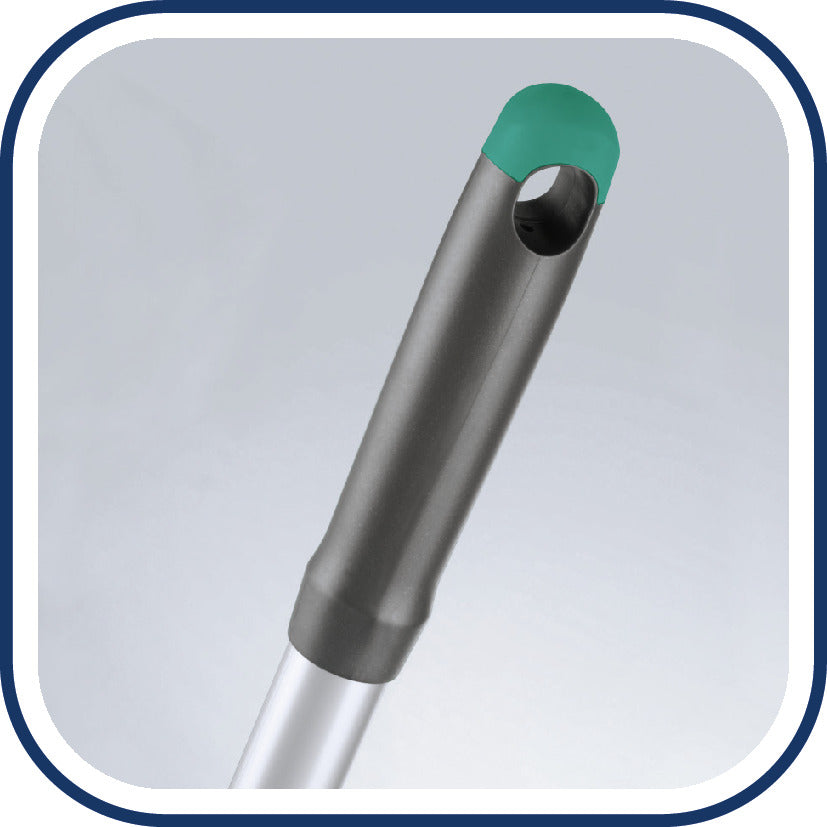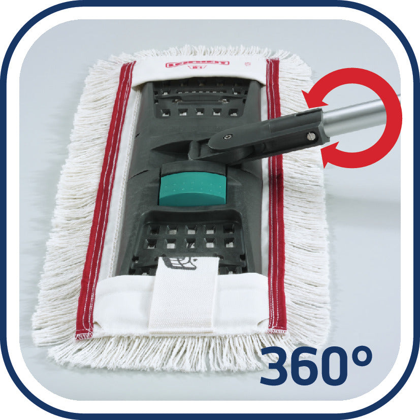- Fäste för press: Fästdon på moppduken möjliggör enkel pressning utan att behöva röra smutsigt vatten, genom att använda en separat Leifheit handpress.