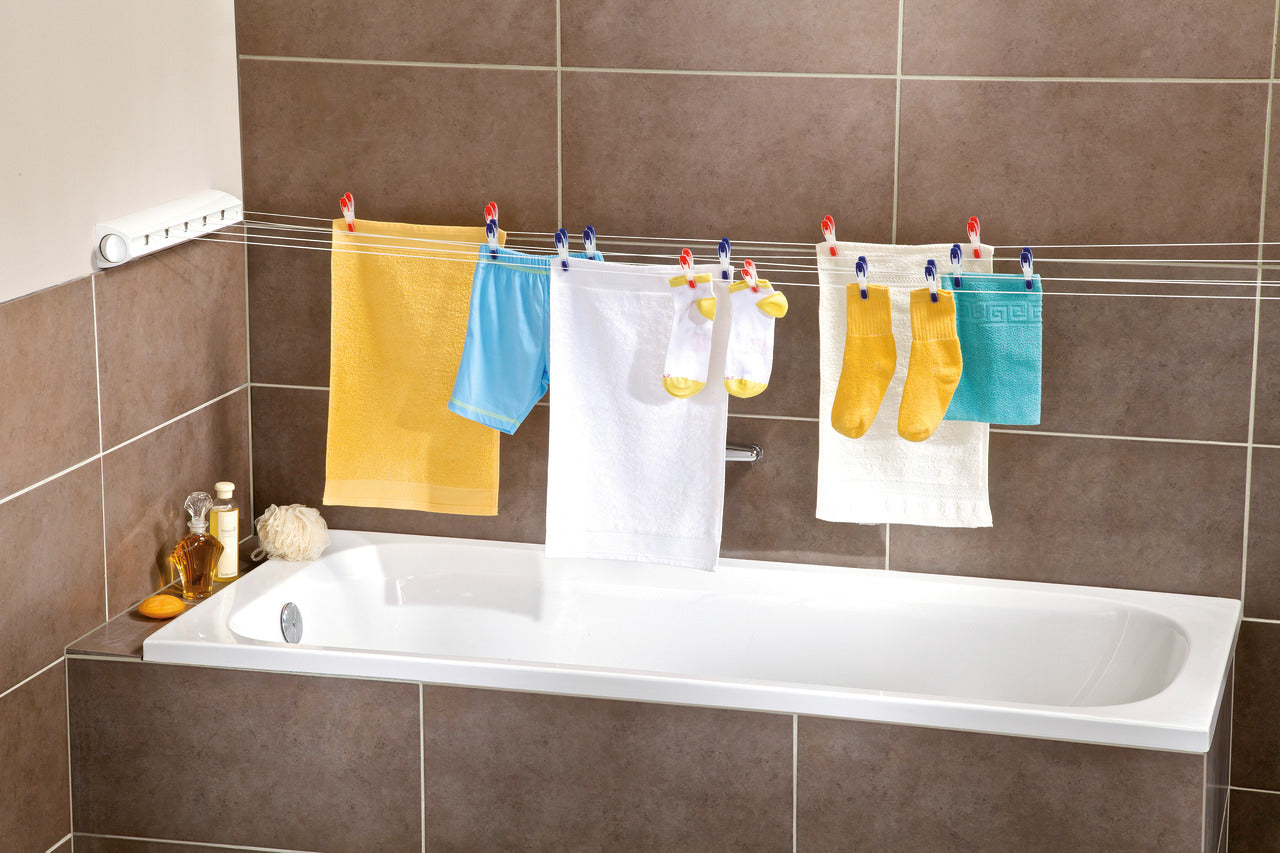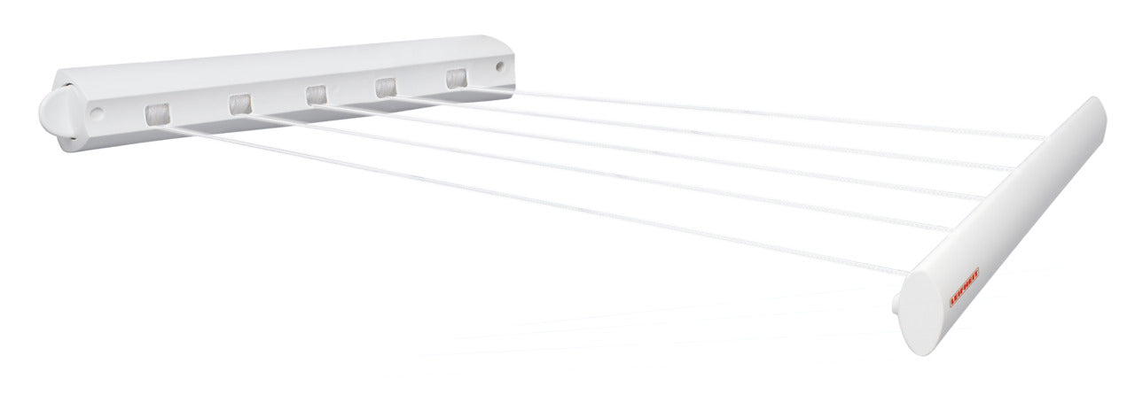 Efter användning tar torkställningen knappt någon plats ? linorna rullas enkelt in med hjälp av linans upprullningsmekanism. En kontrollknapp säkerställer att linorna alltid hålls spända, så att de inte sjunker ner när du torkar tunga föremål som sängkläder. Monteringstillbehör ingår för enkel installation.