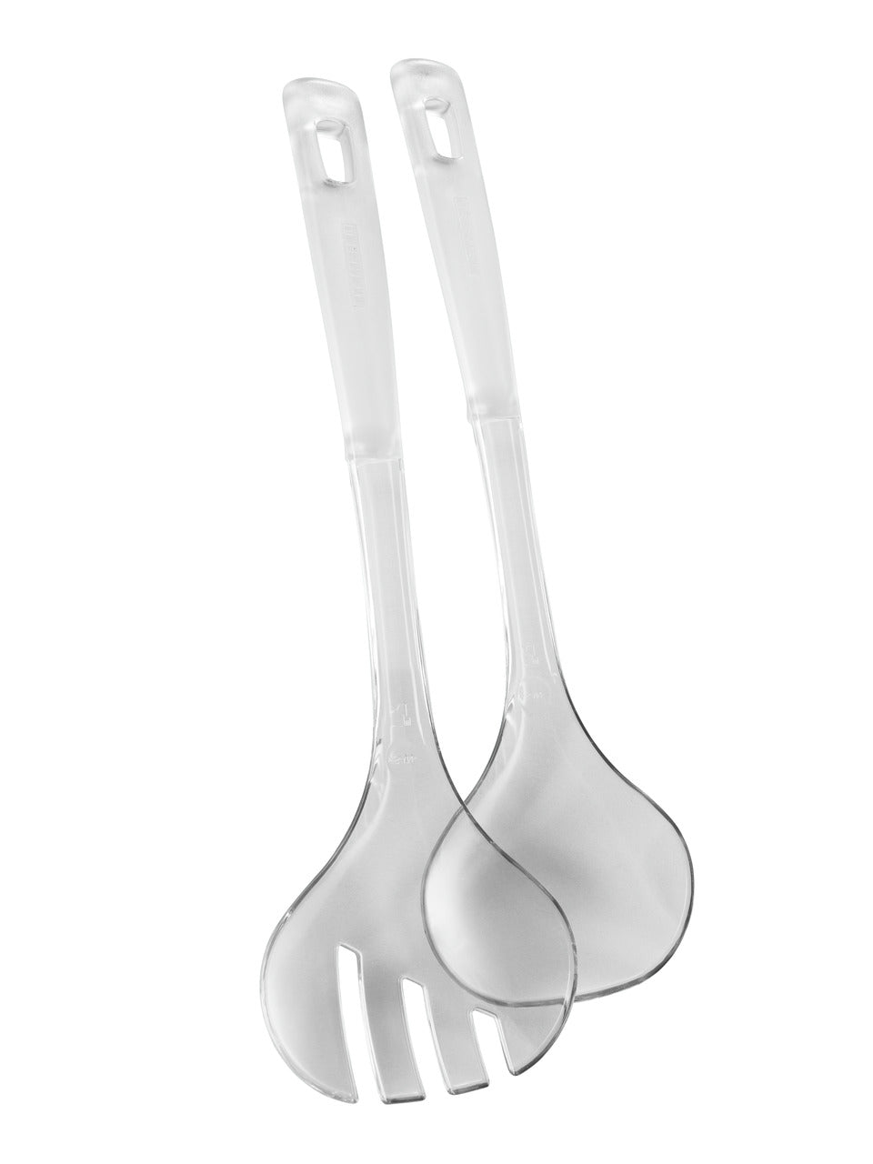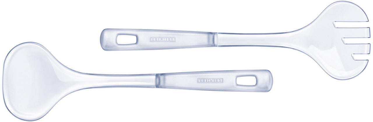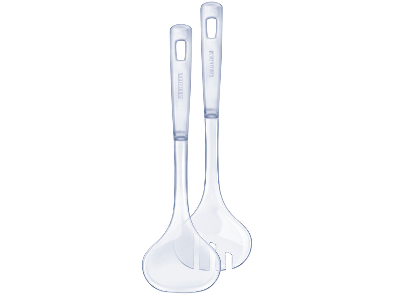 En kärleksfullt tillagad sallad, ett vackert dukat bord ? och serveringsskedar som glider ner i skålen? Det finns ett alternativ. Leifheit salladbestick är tillverkade av klar plast och har två praktiska krokar som gör att de kan hängas på salladsskålens kant. De subtila krokarna finns på baksidan, precis nedanför handtagen, vilket möjliggör en elegant och aptitretande presentation vid alla tillfällen ? även med höga salladsskålar. Salladbestickens design är särskilt attraktiv. Deras moderna, transparenta utseende passar perfekt på middagsbordet och kompletterar vilken salladsskål som helst, medan deras robusta, ergonomiskt formade plast är perfekt för dagligt bruk. Båda besticken är utrustade med öglor och kan hängas på en kroklist för att spara plats. Materialet tål maskindisk.