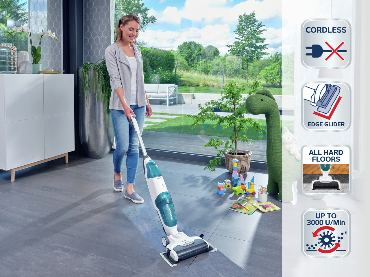 Denna sladdlösa skaftdammsugare är designad för att nå in i varje hörn med sitt hörnglider och Micro-Duo-moppöverdrag som säkerställer att ingen smuts lämnas kvar. Dess smidiga och lättmanövrerade design gör det enkelt att städa även i trånga utrymmen, och med en vikt på endast 3,5 kg är den lätt att hantera.