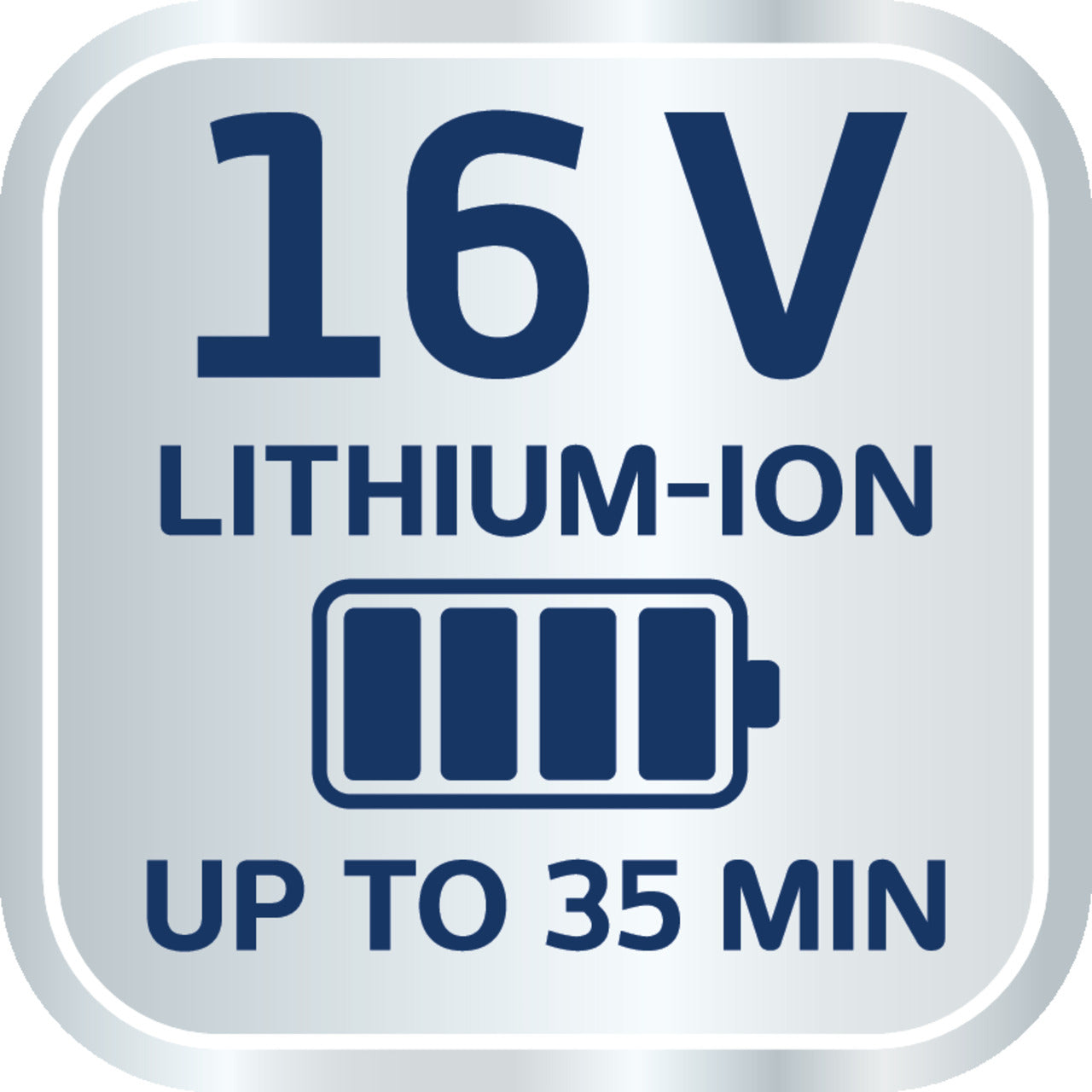 - Långvarigt batteri: 16 V litiumjonbatteri med upp till 35 minuters driftstid.