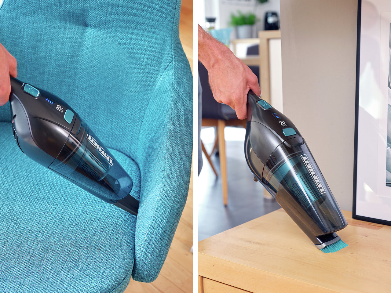 Med BristlePro-teknologi i det elektriska golvmunstycket, som består av täta borstbuntar, avlägsnas smuts och damm enkelt från alla typer av ytor. Den avtagbara handdammsugaren med praktiska borsthuvuden är perfekt för rengöring av små och svåråtkomliga områden, såsom mellan soffkuddar eller på känsliga ytor.
