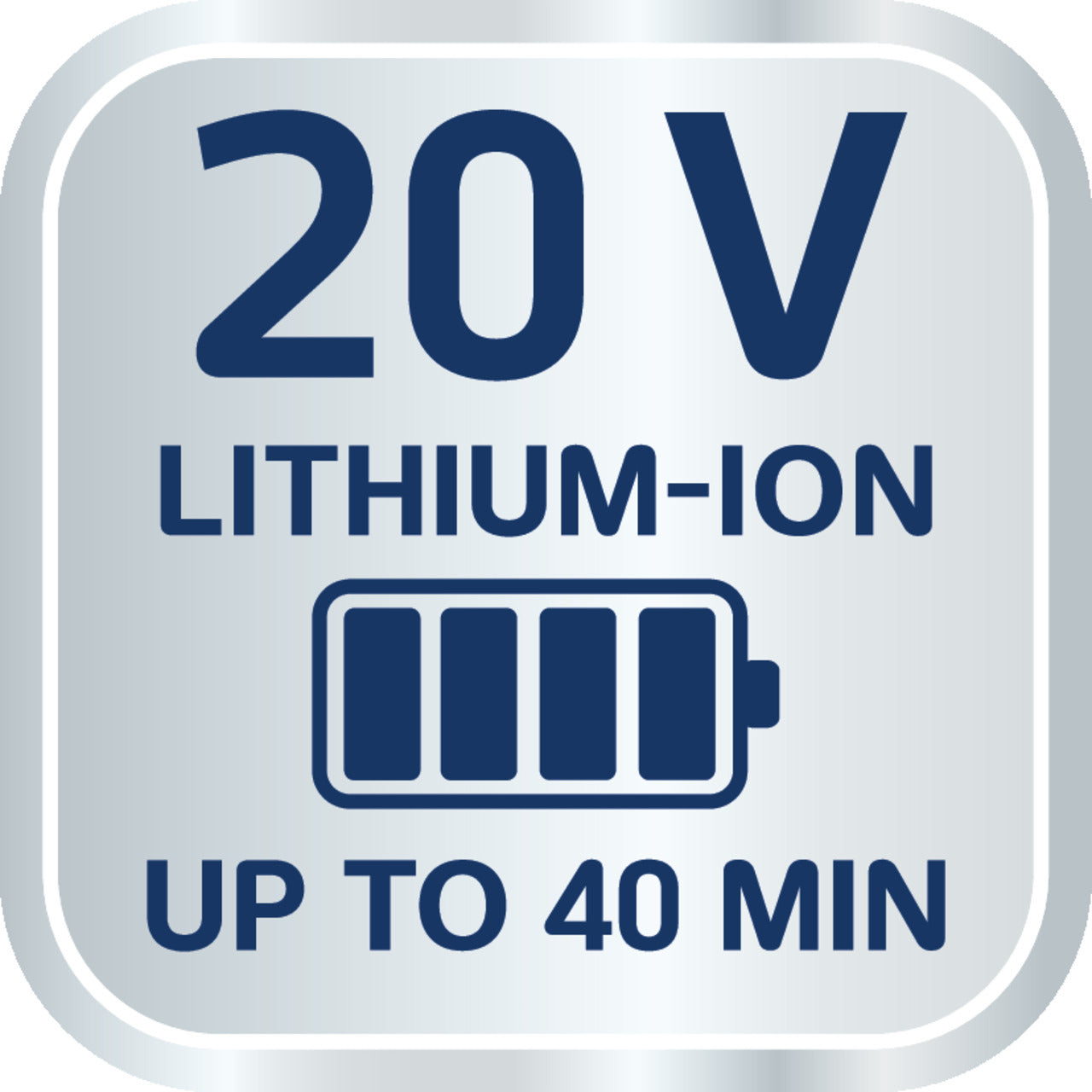 - Lång batteritid: 20V litiumjonbatteri med upp till 40 minuters driftstid.